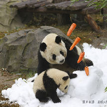 忽如一夜入寒冬,成都大熊貓繁育研究基地連夜從山上拉來的無污染水為原料制造的皚皚白雪,在今早給熊團子們一個驚喜,新年的特有“年貨”!“啊嗚”!小滾滾一口吃掉了雪人的鼻子~